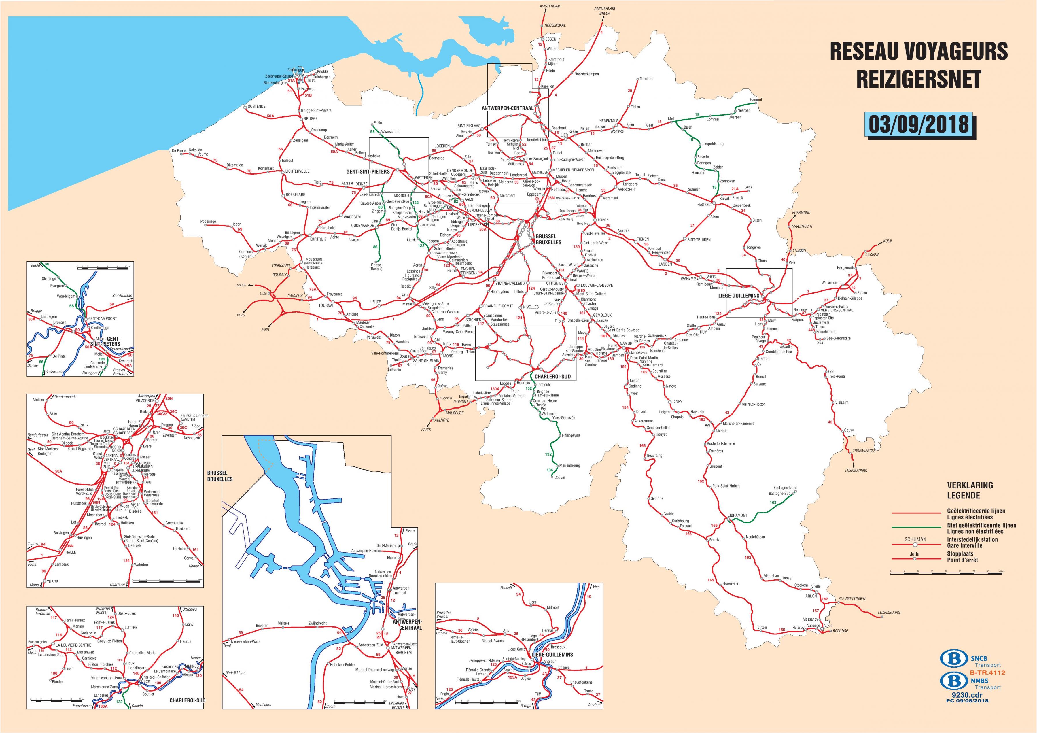 Belgium train stations map. Belgium train map (Western Europe - Europe) to print. Belgium train map (Western Europe - Europe) to download. The train network in Belgium is run by the SNCB which stands for Société Nationale des Chemins de fer Belges, and means National Society of Belgian Railways. As Belgium is also a Dutch (Flemish) speaking nation, you will also see and hear the SNCB referred to as the Nationale Maatschappij der Belgische Spoorwegen (NMBS) as its shown in Belgium train map. It is a good idea to get to grips with the Flemish and French names as this could be confusing if you are a first-time traveler in Belgium.